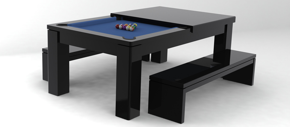 Biliardový stôl Riley Hampton – kombinovaný jedálensko-biliardový stôl je vyrobený z dýhy, svojim vzhľadom je porovnateľný ku klasickému jedálenskému stolu, rovný rám so štvorcovými nohami, jednodielna talianska bridlica o hrúbke 19 mm.