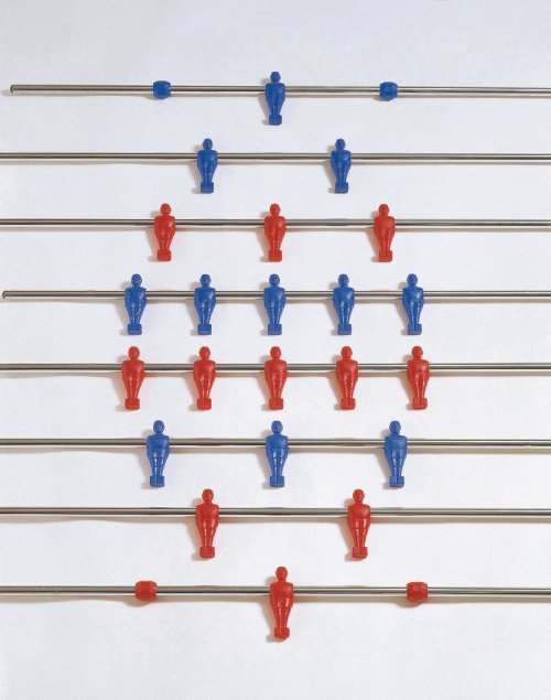 Sada obsahuje: 100 cm tyč s 5 modrými hráčmi, 100 cm tyč s 5 červenými hráčmi, 108 cm tyč s 3 modrými hráčmi, 108 cm tyč s 3 červenými hráčmi, 122 cm tyč s 2 modrými hráčmi, 122 cm tyč s 2 červenými hráčmi, 106 cm tyč s 1 modrým hráčom a 106 cm tyč s 1 červeným hráčom.